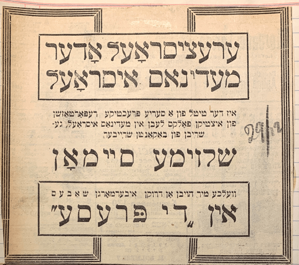 “…is the title of a series of splendid reports of the current folk life in the State of Israel, written by the well-known writer Solomon Simon, which we begin printing the day after tomorrow in Di Prese. And here is how the first words of his introduction appeared: